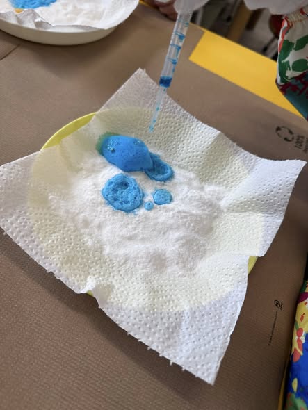 Podczas zajęć sensorycznych dzieci eksperymentowały z sodą oczyszczoną, obserwując jak zmienia się w kontakcie z innymi składnikami.